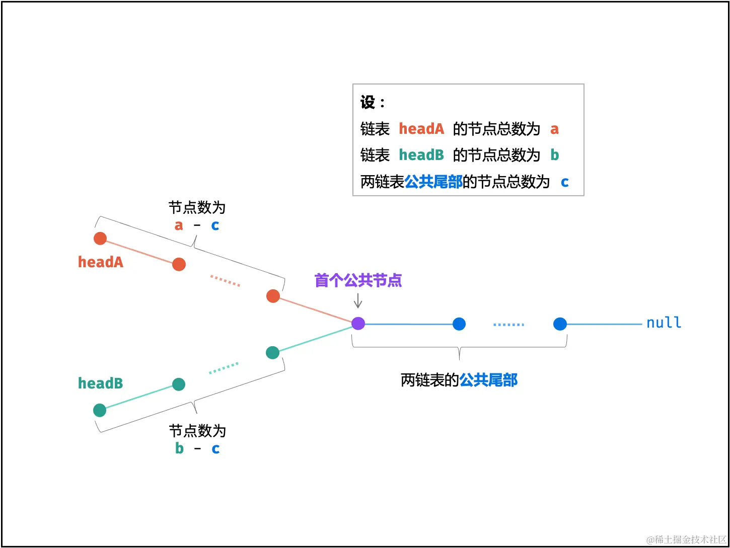 设「[第一个公共节点」为 node ,「链表 headA」的节点数量为 a ,「链表 headB」的节点数为b , 「两链表的公共尾部」的节点数量为 c ,则有: