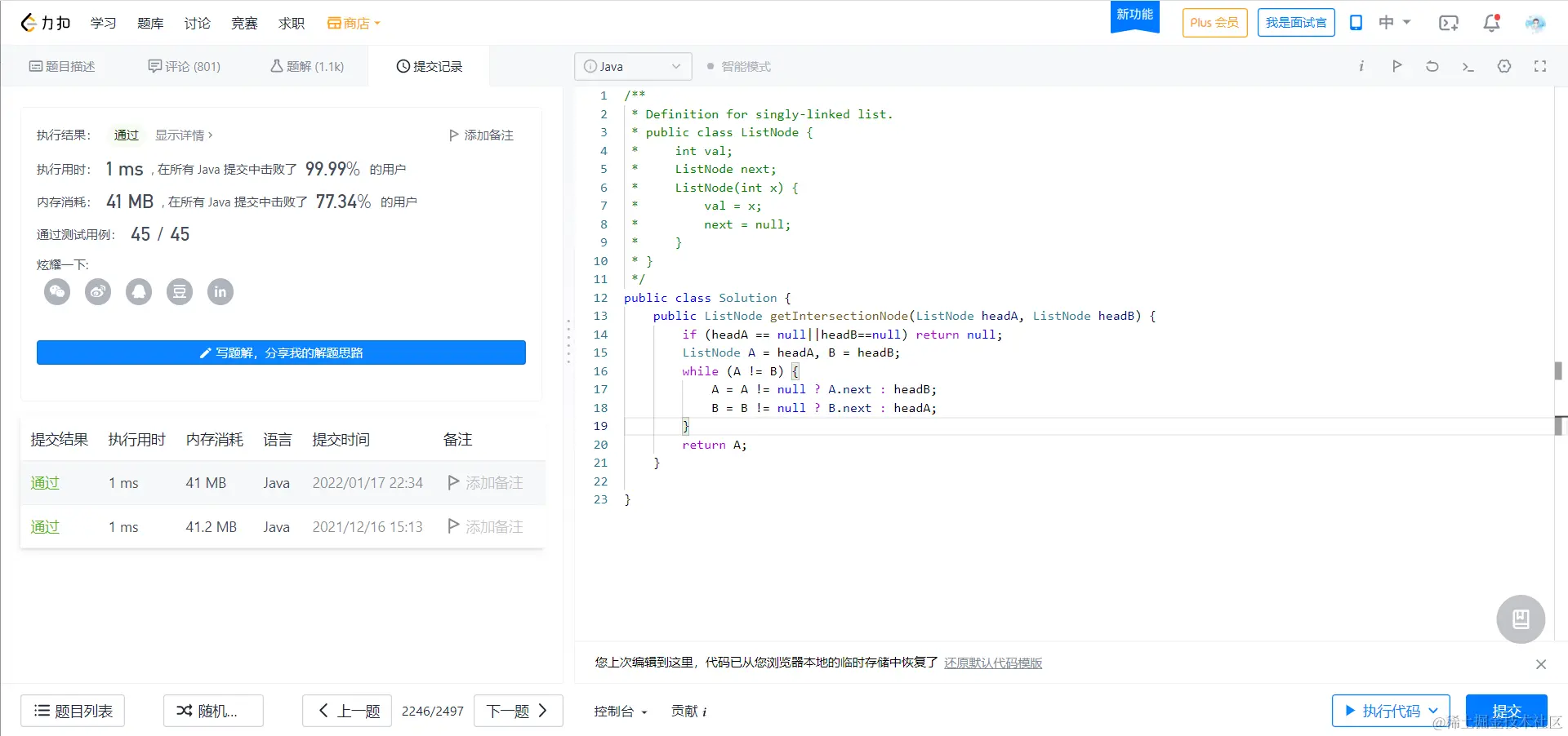 - 时间复杂度: O(m +n),中m和n是分别是链表headA和headB的长度。需要遍历两个链表各一次。