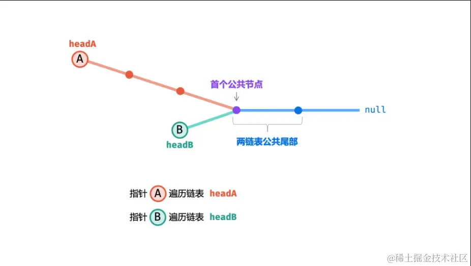 考虑构建两个节点指针 A , B 分别指向两链表头节点 headA , headB ,做如下操作: