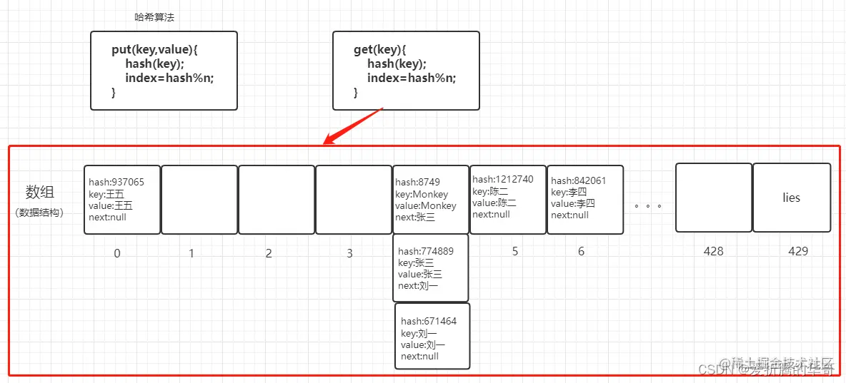 1、get方法传入key,key通过哈希算法算出来这个值,这个值就是它的下标,