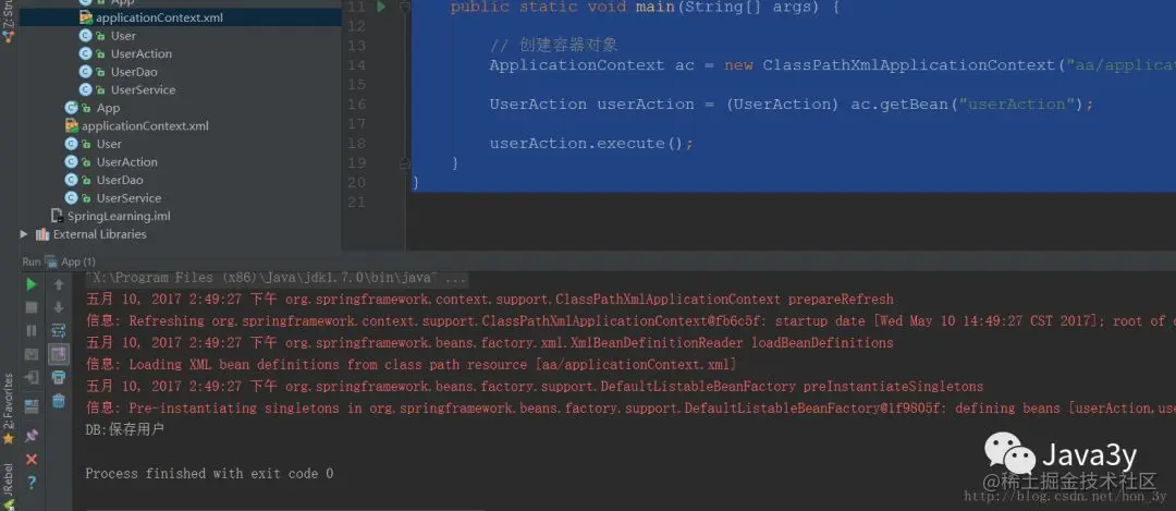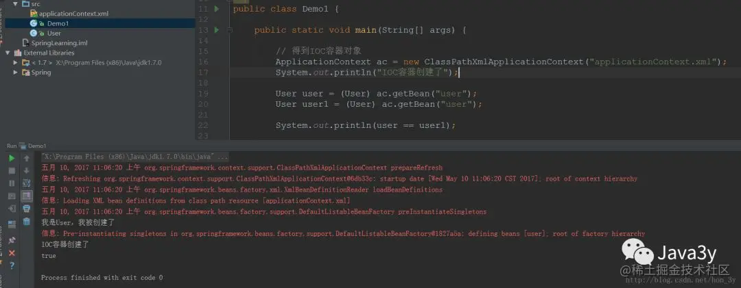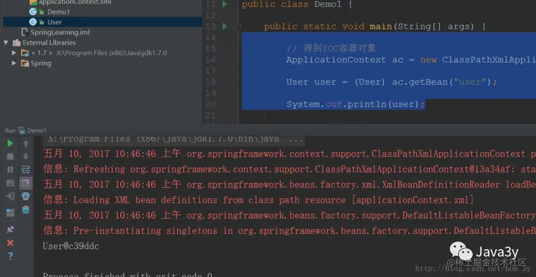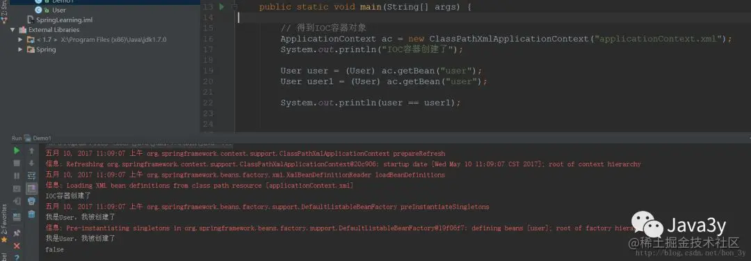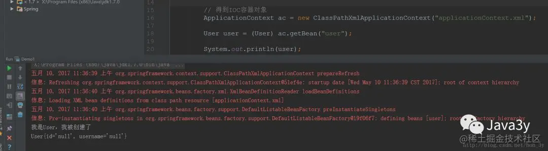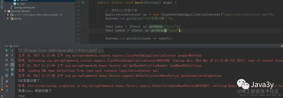 - 我们在User的构造函数中打印出一句话,就知道User对象是什么时候创建了。