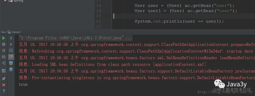 - 当我们使用singleton【单例】的时候,从IOC容器获取的对象都是同一个: