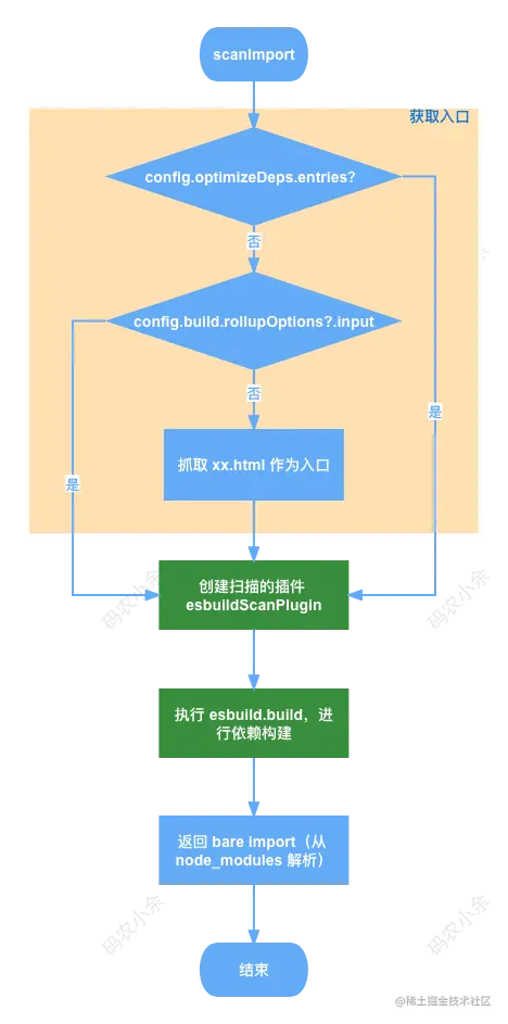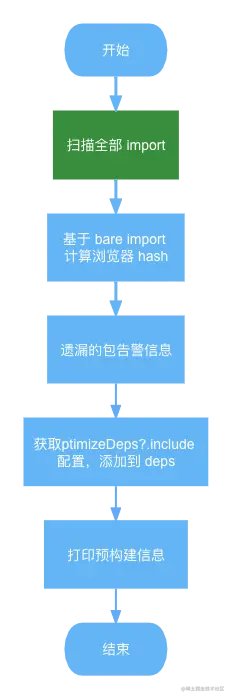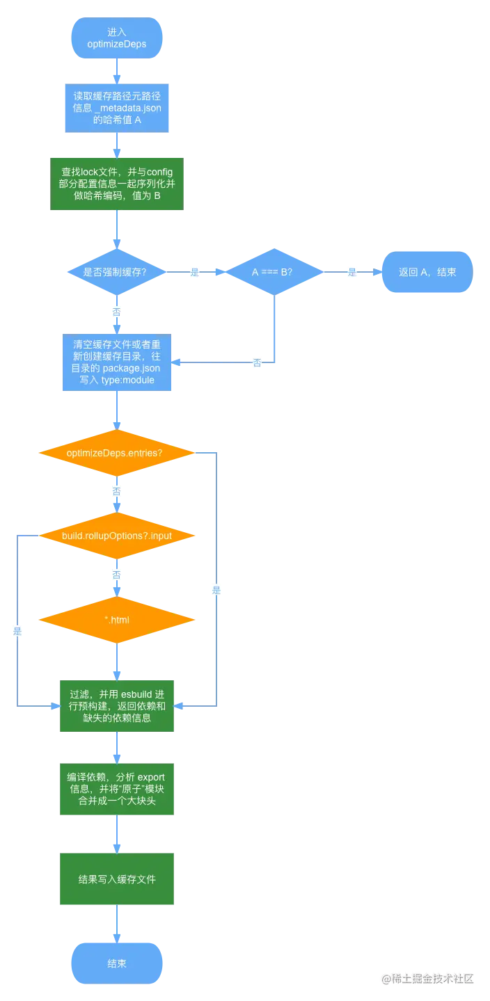 入口处将配置 config 和是否强制缓存的标记(通过 --force 传入或者调用 restart API)传到 optimizeDeps。optimizeDeps 逻辑比较长,我们先通过流程图对整个流程有底之后,再按照功能模块去阅读源码。