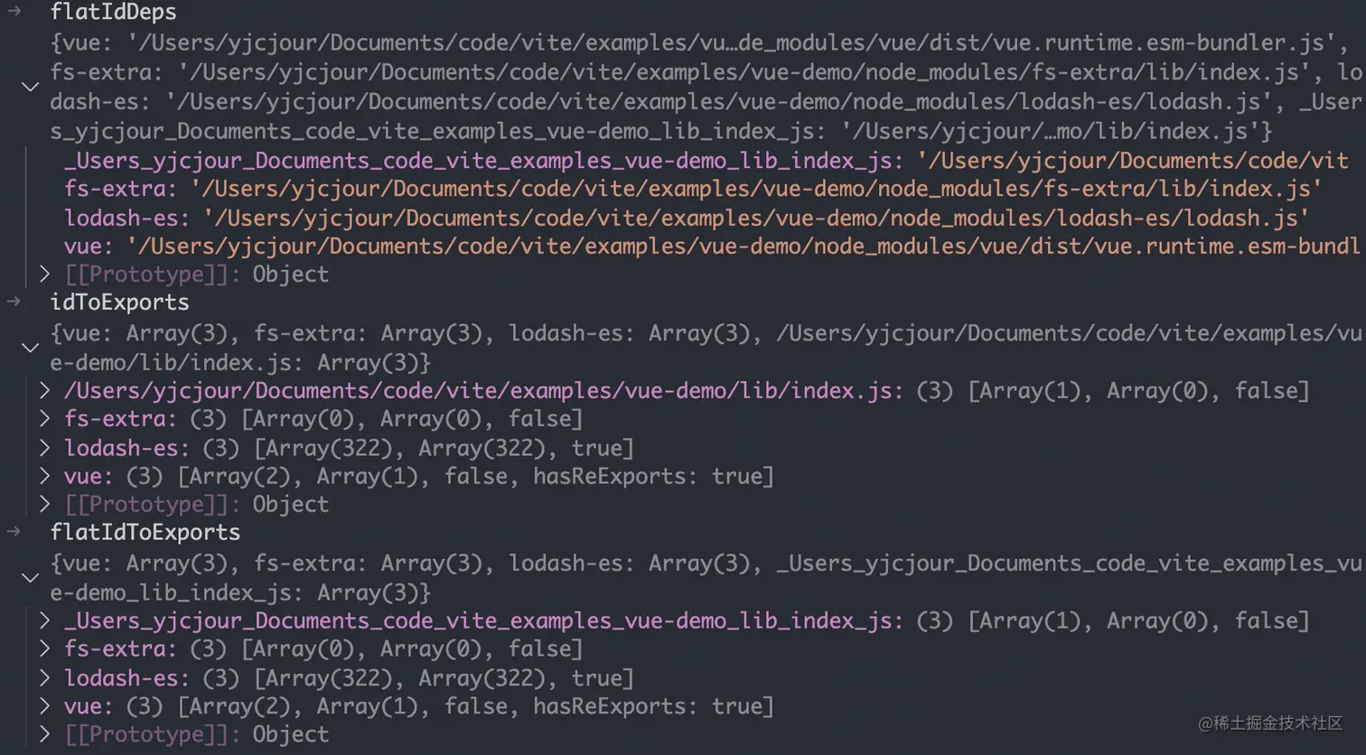 - 最后使用 es-module-lexer 对 deps 模块进行模块化分析,拿到分析结果做预构建。构建结果将合并内部模块、转换 CommonJS 依赖。最后更新 data.optimizeDeps 并将结果写入到缓存文件。