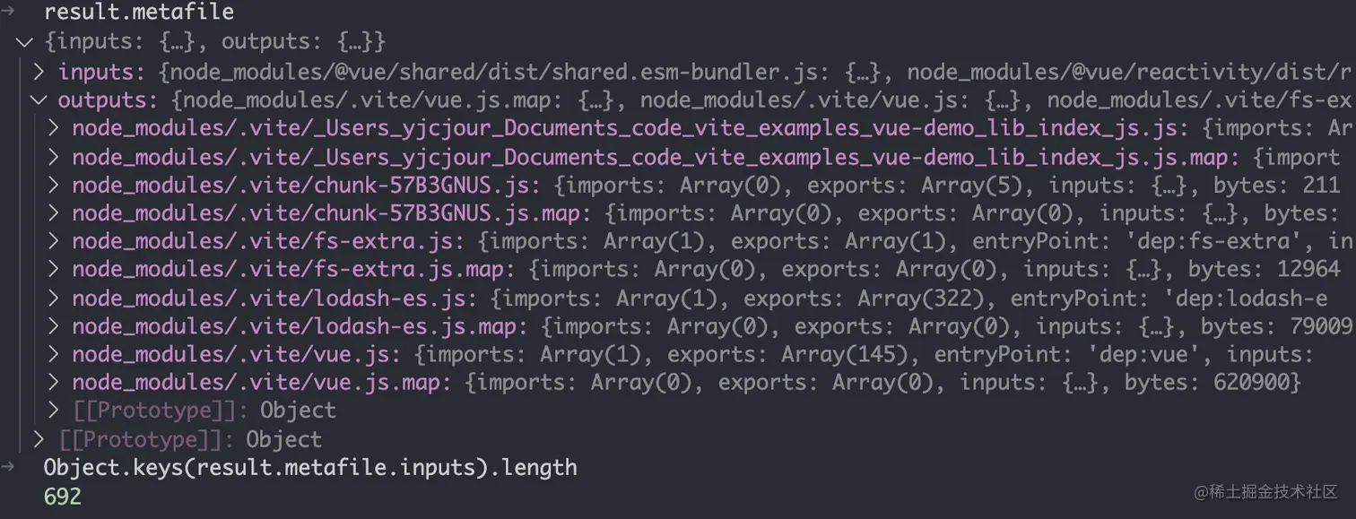 完成整个预构建的依赖查找之后,就会执行构建,构建后的 metafile 信息如下: