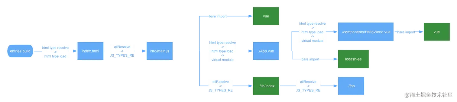 首先,上述 flatIdDeps 作为入口,先依次执命中 /^[\w@][^:]/ filter 的解析,最后都会通过 resolveEntry 套上 namespace: dep 的类型。然后执行 namespace: dep 的 load 回调。接下来的流程通过一张图去展示: