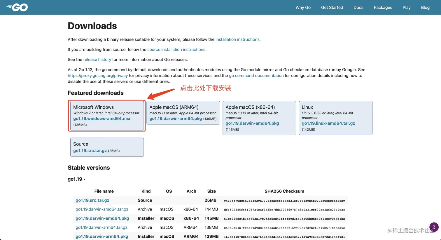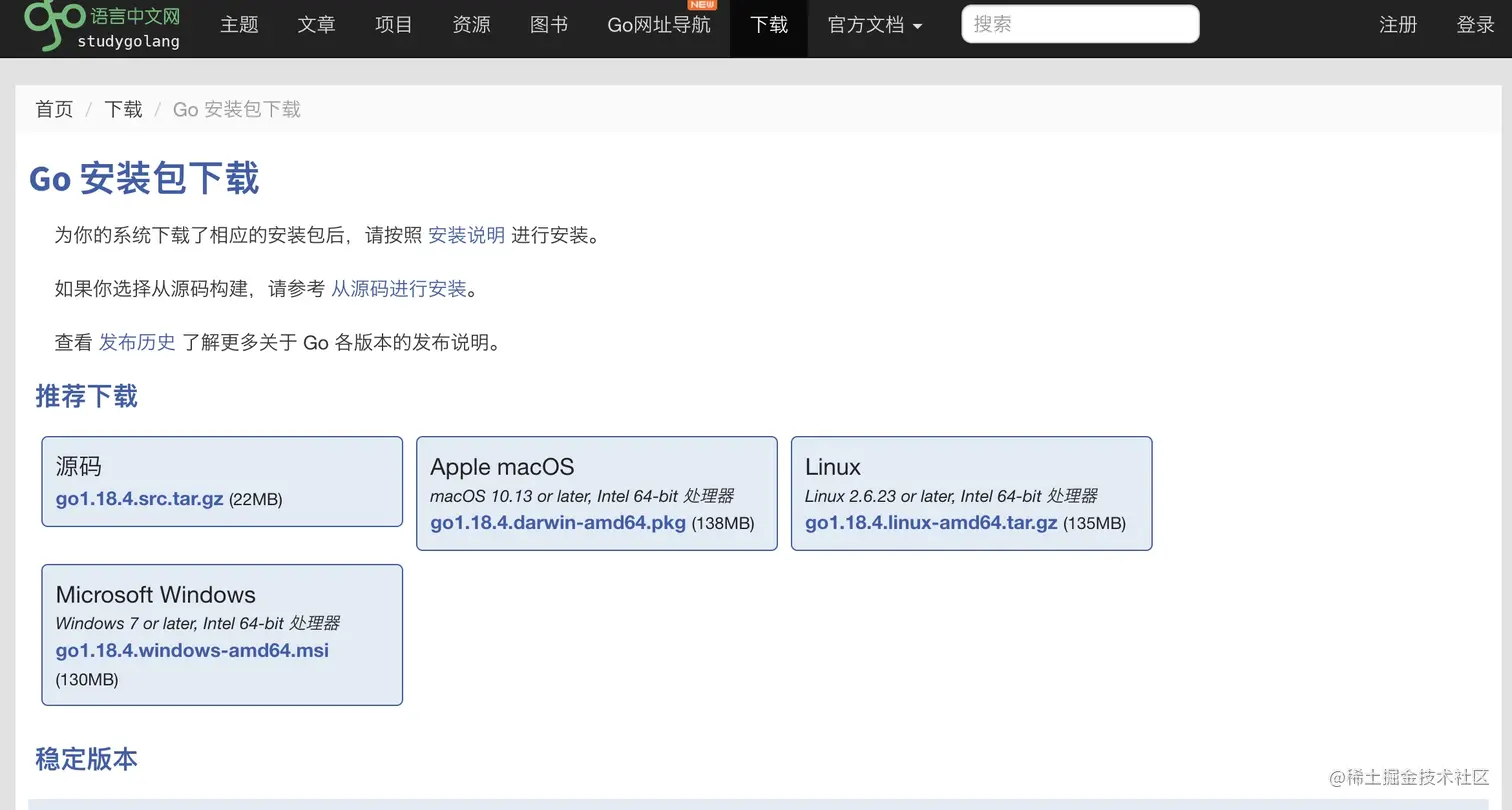 如果上面的网站访问不了的话,推荐选择 Go 语言中文网进行下载,点此处进入如下下载界面 :