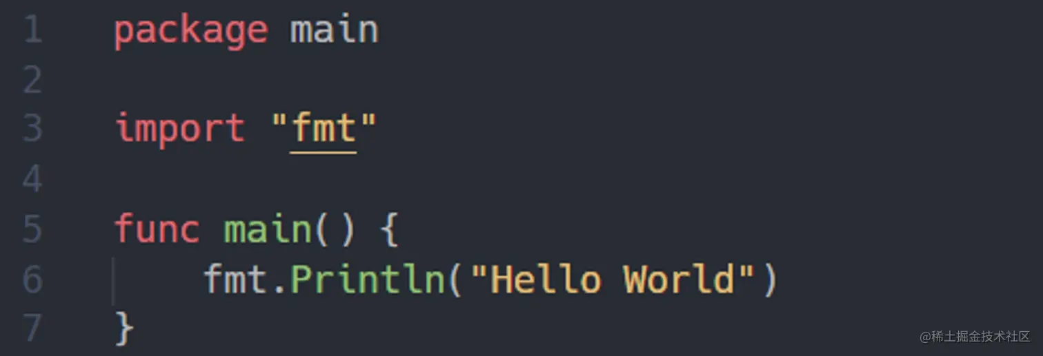 fmt.Println("Hello World") : 该声明由三个部分组成。 首先,我们访问 fmt 包中的另一个函数 Println(即 fmt.Println 部分,Println 表示打印行)。 然后我们创建一个包含 Hello World 的新字符串,并以该字符串作为第一个也是唯一的参数调用(也称为调用或执行)该函数。