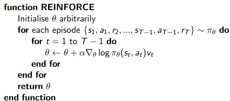 这里我们讨论最简单的策略梯度算法,蒙特卡罗策略梯度 reinforce 算法, 使用价值函数 $v(s)$ 来近似代替策略梯度公式里面的 $Q_{\pi}(s,a)$。算法的流程很简单,如下所示: