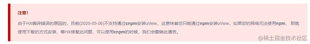注意:不支持通过cnpm安装uView!我在这里踩坑了,使用cnpm安装后,会出现一些奇怪的报错