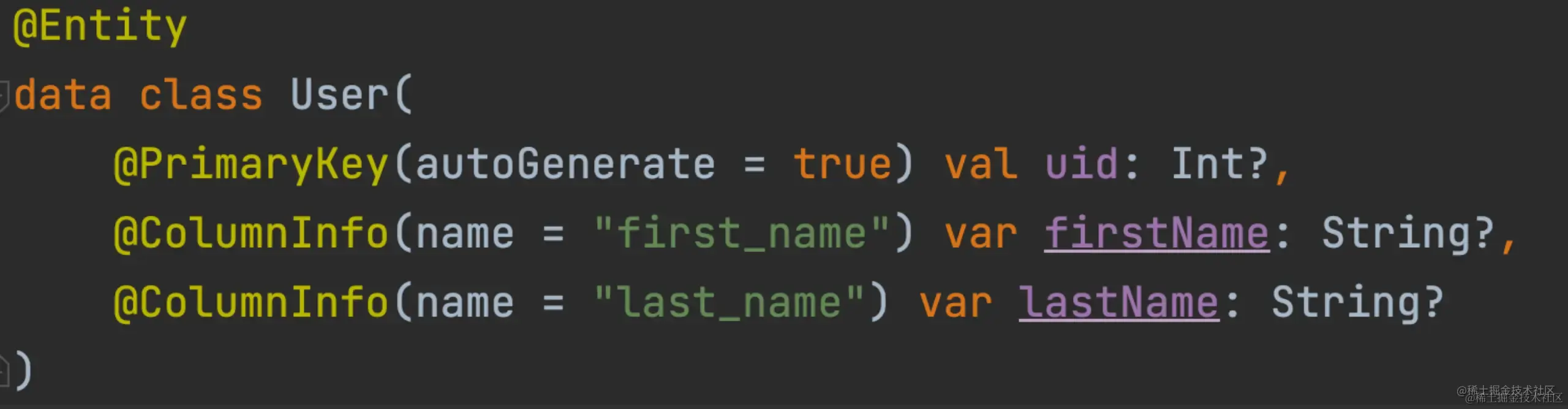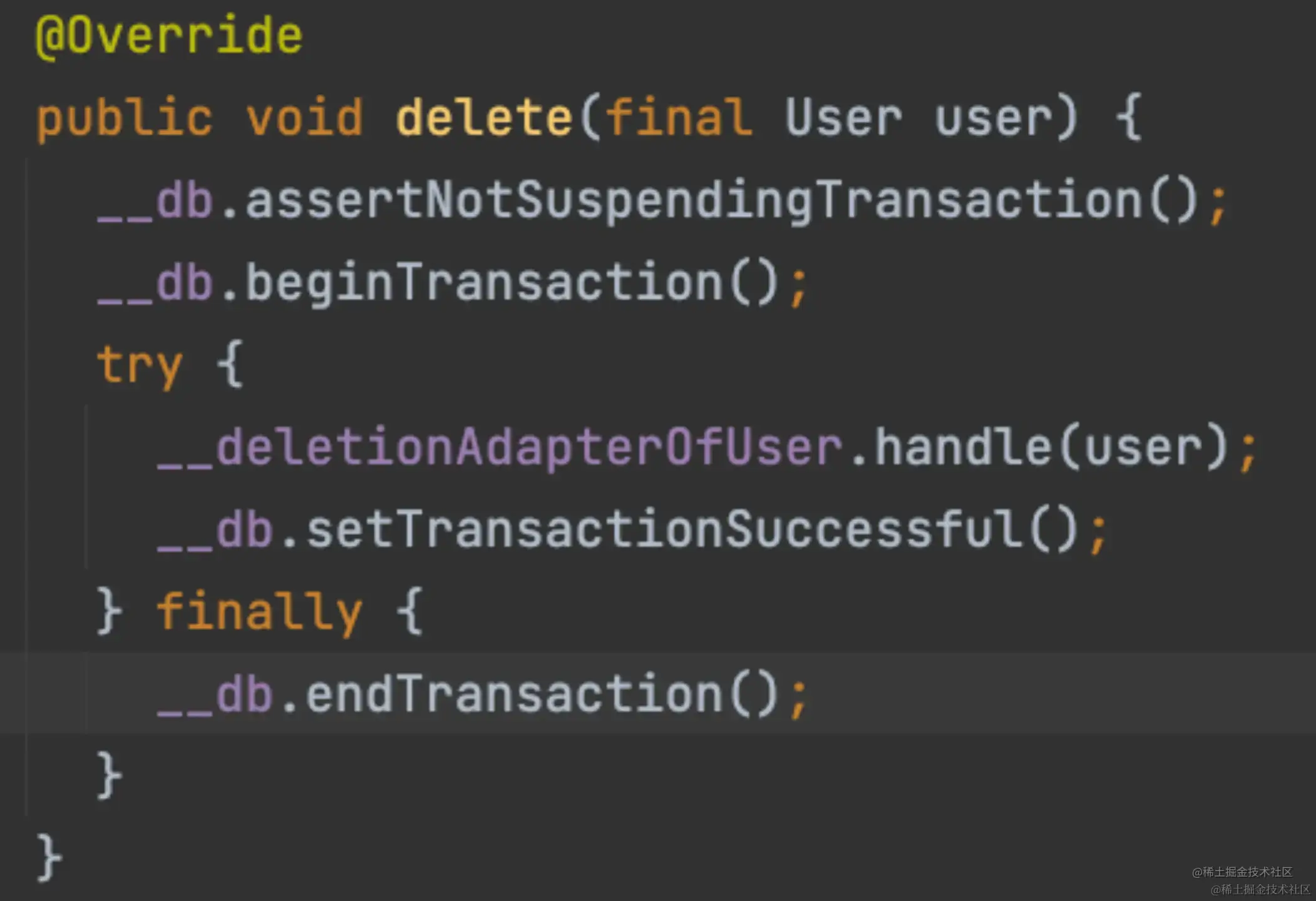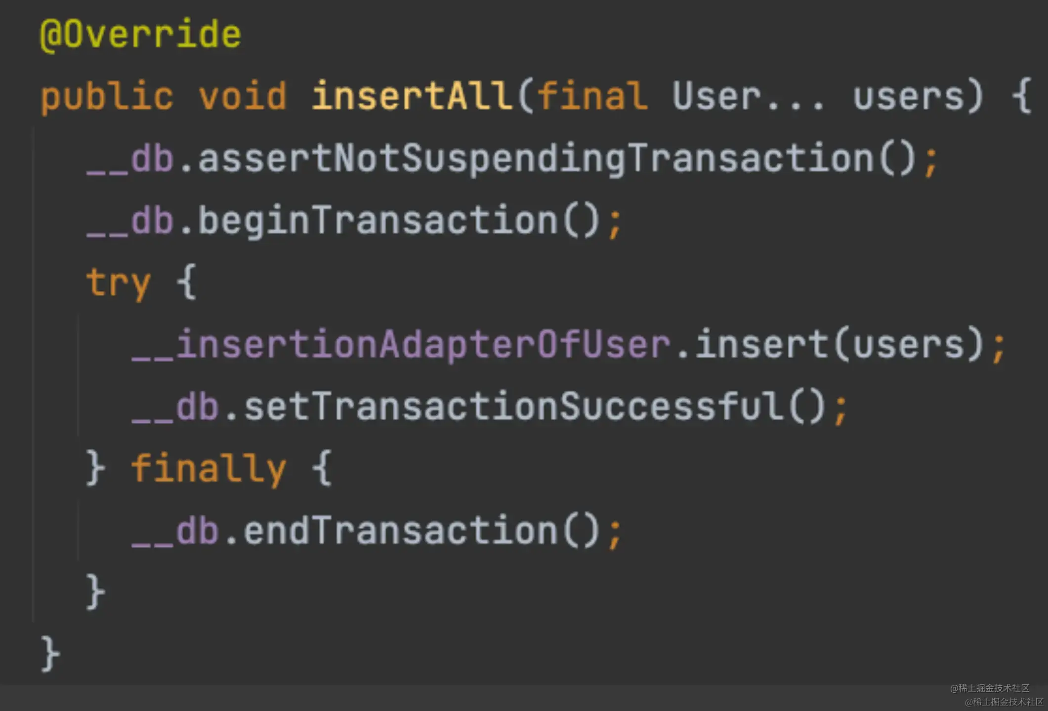 __db:RoomDatabase的实例 __insertionAdapterOfUser :EntityInsertionAdapterd实例,用于数据insert __deletionAdapterOfUser:EntityDeletionOrUpdateAdapter实例,用于数据的update/delete