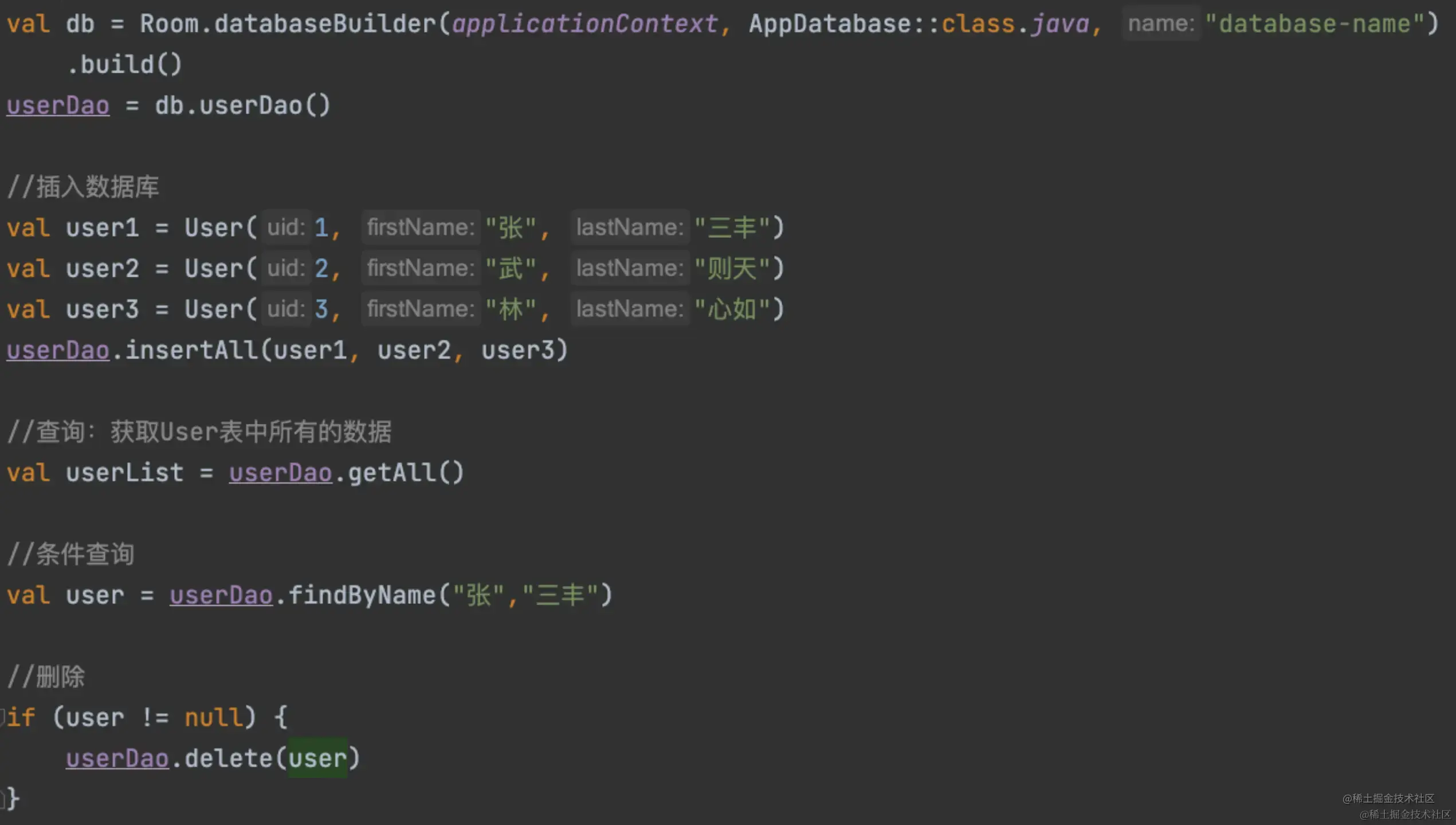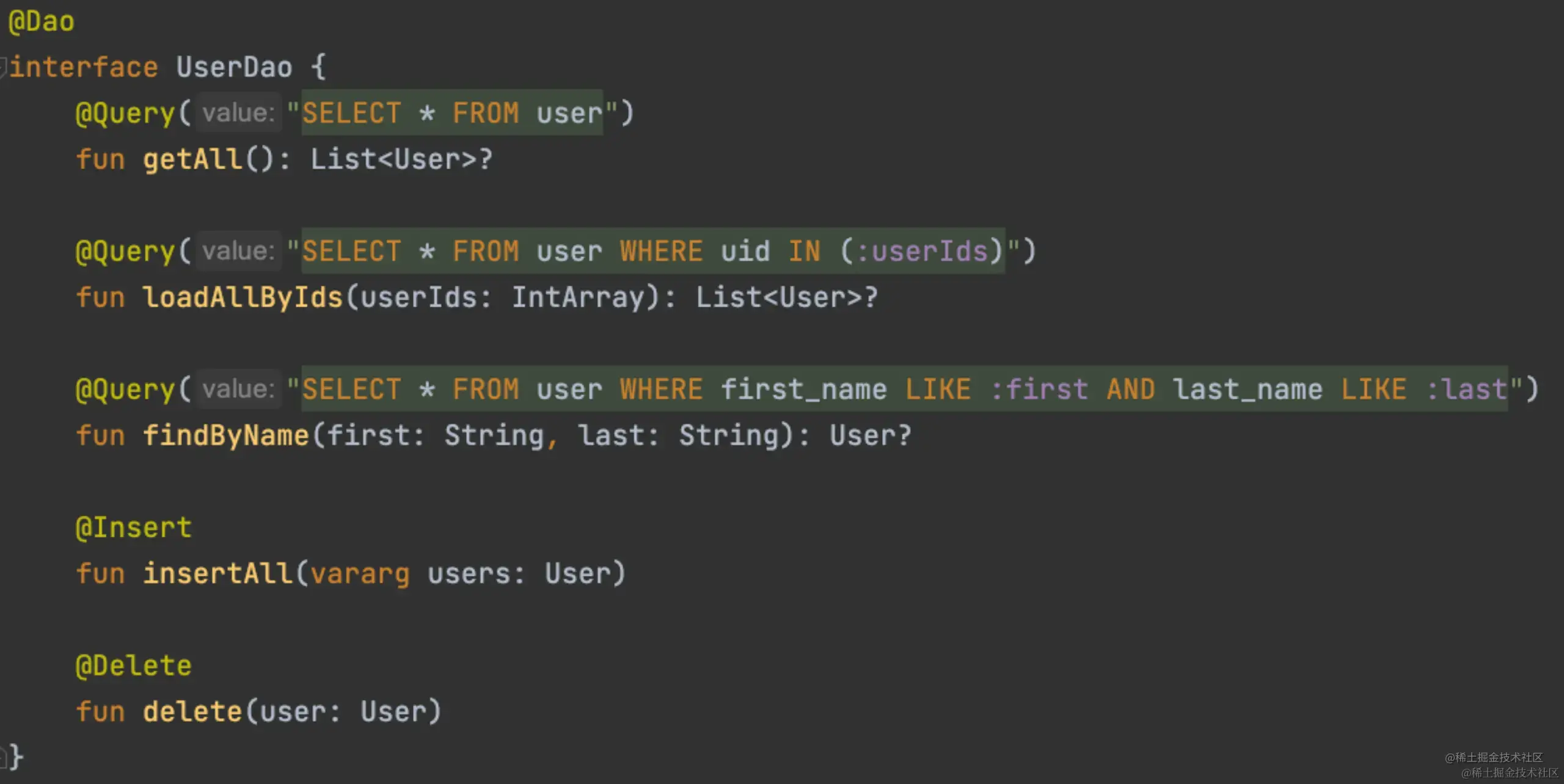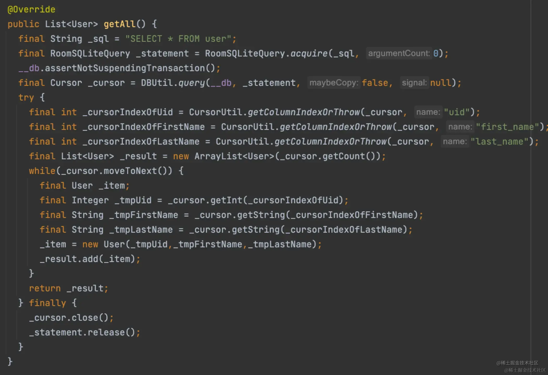 delete():使用__db开启事务,使用__deletionAdapterOfUser执行删除操作 getAll():使用Cursor循环读取数据库的每条记录,并将结果保存在List<User>中返回 loadAllByIds():和getAll()类似,查询语句不同 findByNames():和getAll()类似,查询语句不同
