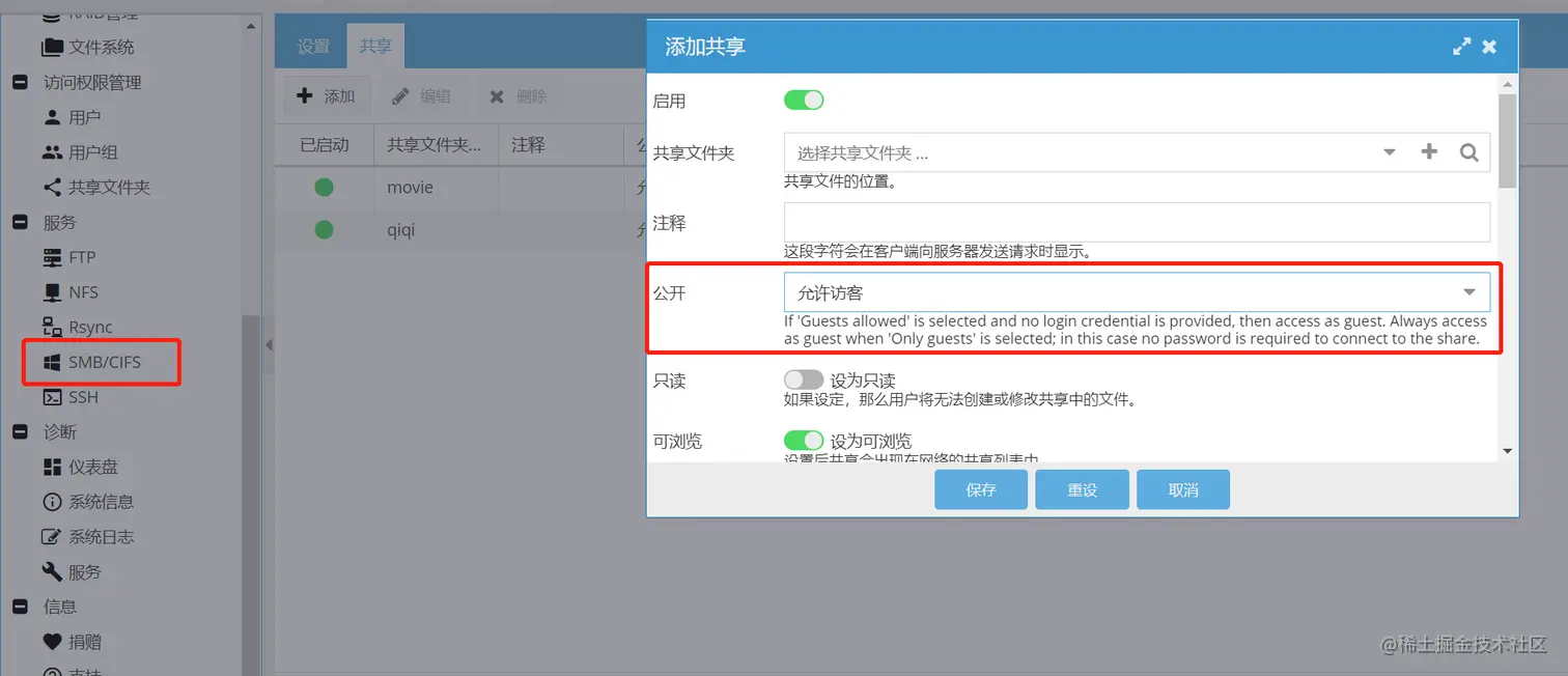 我一般会开最大权限,内网访问也不怕,除非你把你们家WIFI密码共享出去了,建议有条件的开朋友网络,设置不是一个ip段和ip隔离,名称记得用英文 路径会自动带入 不建议跟我一样用/做路径 至少也是