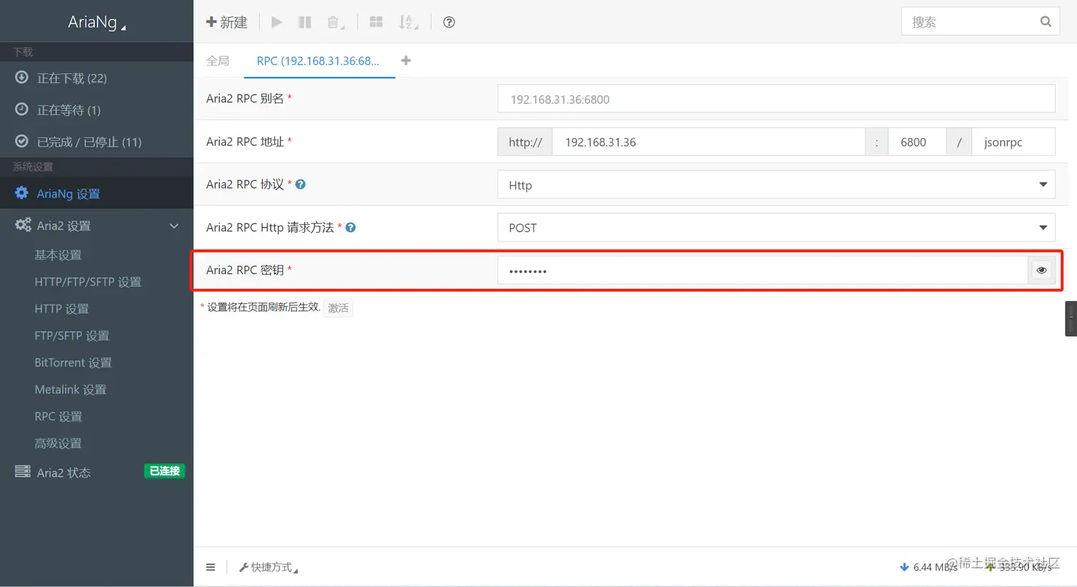 来到设置页,输入你在aria配置文件中配置的密钥,随后就开始享受aria2下载吧