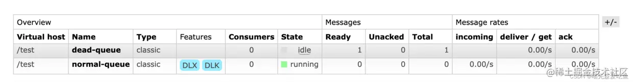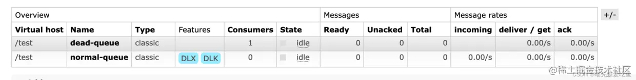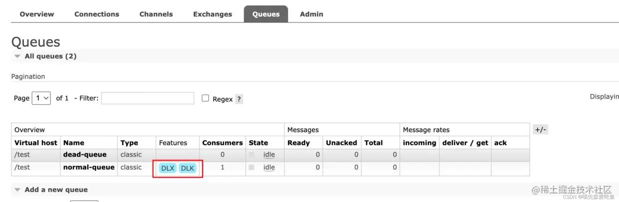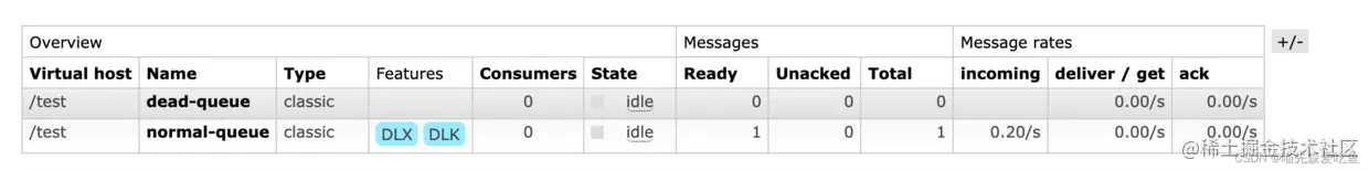 消费者1启动后进入RabbitMQ系统后台,可以看到队列 normal-queue 的 features 一列多了两个信息。其中 DLX 表示死信交换机,DLK 表示死信交换机的路由键(RoutingKey)。