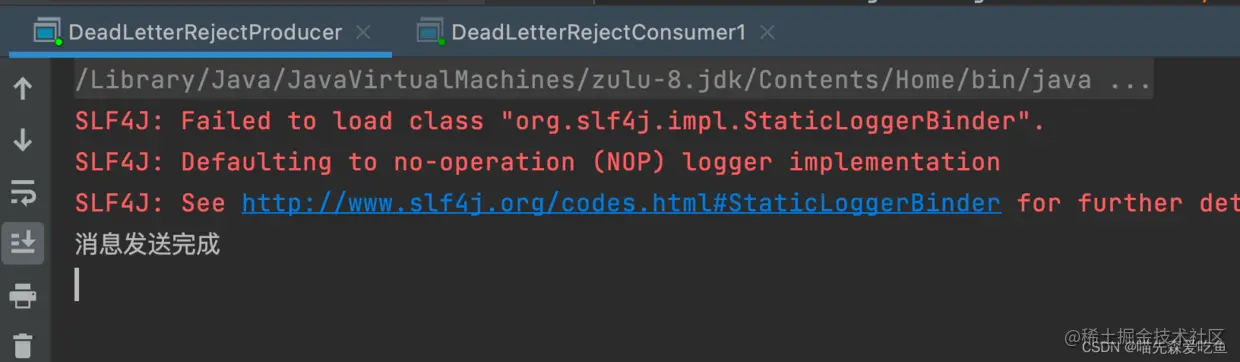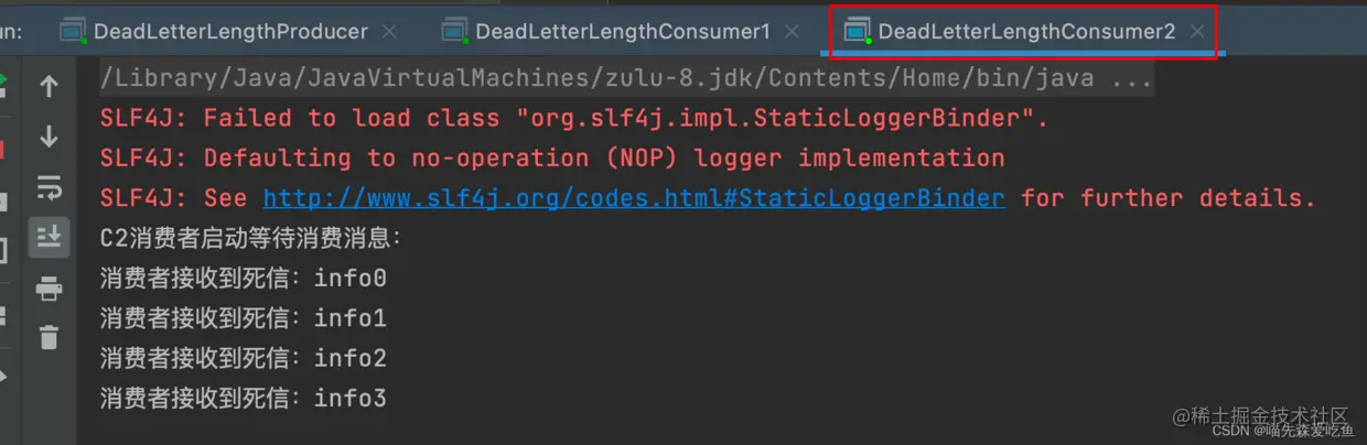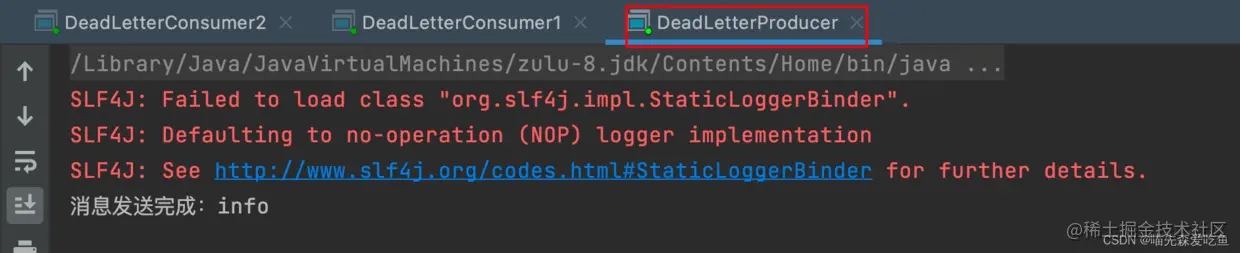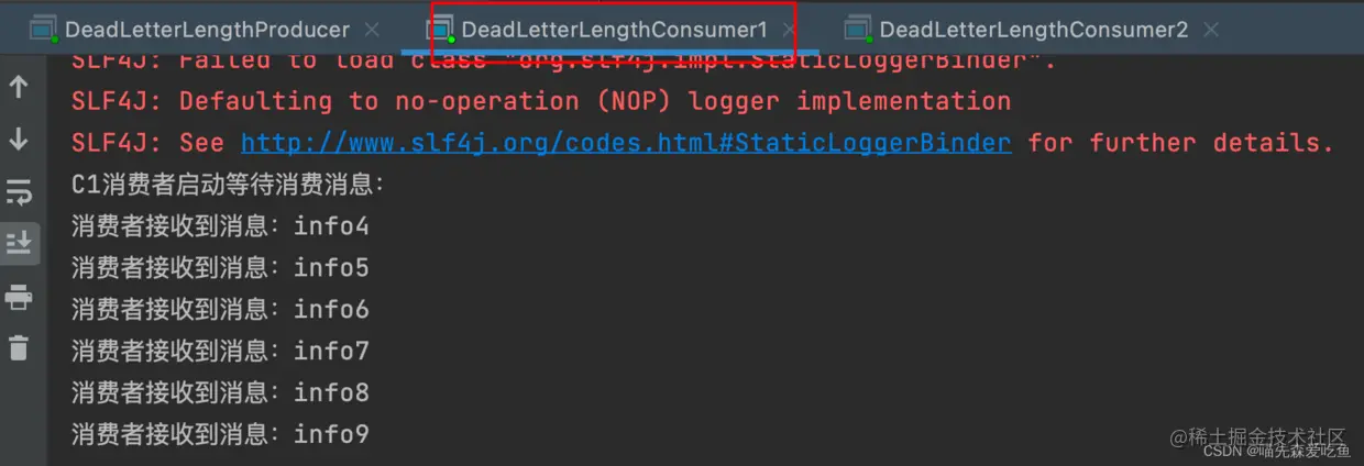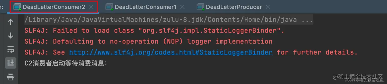 先启动消费者1,将正常交换机、死信交换机、正常队列、死信队列创建出来,否则会报错。接着启动消费者2,然后在启动生产者,观察控制台。