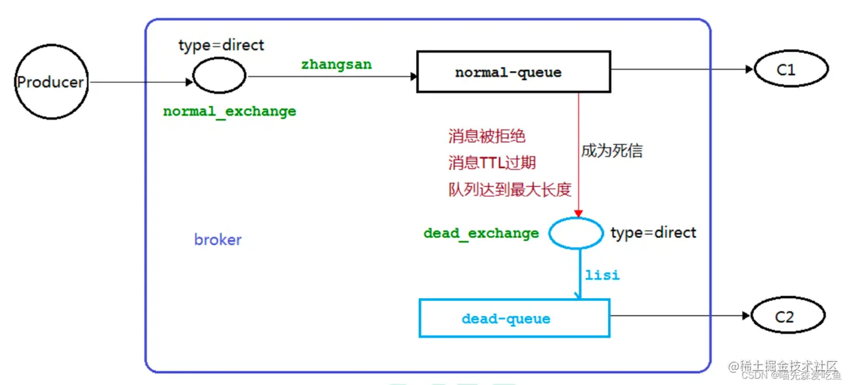 • 消息被拒绝(basic.reject 或 basic.nack)并且 requeue=false(不再重新入队)