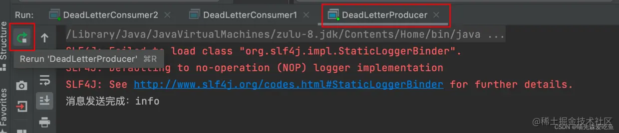 将消费者1和消费者2的服务停止,重新运行生产者,10s 后消息会被进入到死信队列
