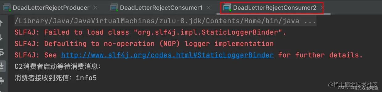 System.out.println("消费者接收到死信:" + receivedMessage);