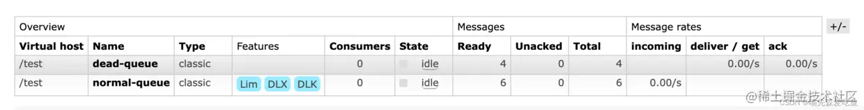 普通队列中有 6 条消息未消费,超出队列长度的 4 条消息进入到了死信队列。