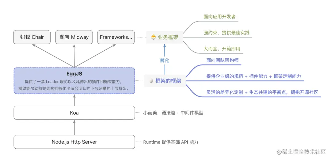 在具体实现上,其实 egg-core 这个库才是框架的框架的承载者,egg 则是一个集成了常用插件列表的可以开箱即用的应用框架。这是当时设计上的一个局限性,虽然也正因如此让 EggJS 在社区使用更广泛,但毕竟给上层框架的定制带来了一些束缚。