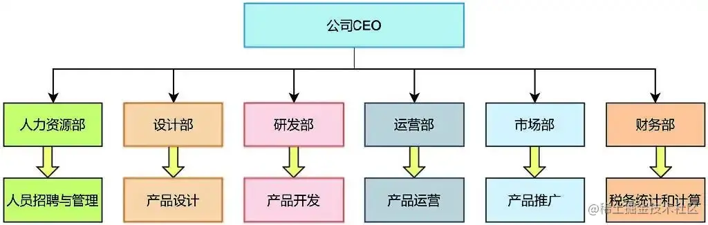 可以类比现实生活中的场景来理解分工,例如,如果你是一家上市公司的 CEO,那么,你的主要工作就是规划公司的战略方向和管理好公司。就如何管理好公司而言,涉及的任务就比较多了。