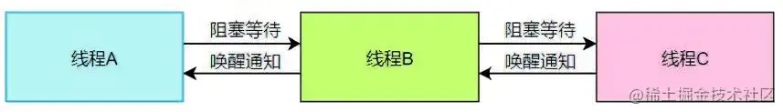线程 A 需要阻塞等待线程 B 执行完任务才能开始执行任务,线程 B 需要阻塞等待线程 C 执行完任务才能开始执行任务。线程 C 执行完任务会唤醒线程 B 继续执行任务,线程 B 执行完任务会唤醒线程 A 继续执行任务。