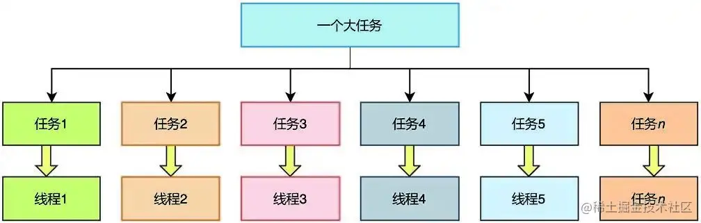 关于分工,比较官方的解释是: 一个比较大的任务被拆分成多个大小合适的任务,这些大小合适的任务被交给合适的线程去执行。