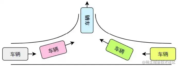 互斥问题在现实中的一个典型场景就是交叉路口的多辆车汇入一个单行道,如图6所示。