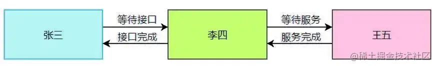 例如,张三、李四和王五共同开发一个项目,张三是一名前端开发人员,他需要等待李四的开发接口任务完成再开始渲染 页面,而李四又需要等待王五的服务开发工作完成再写接口。