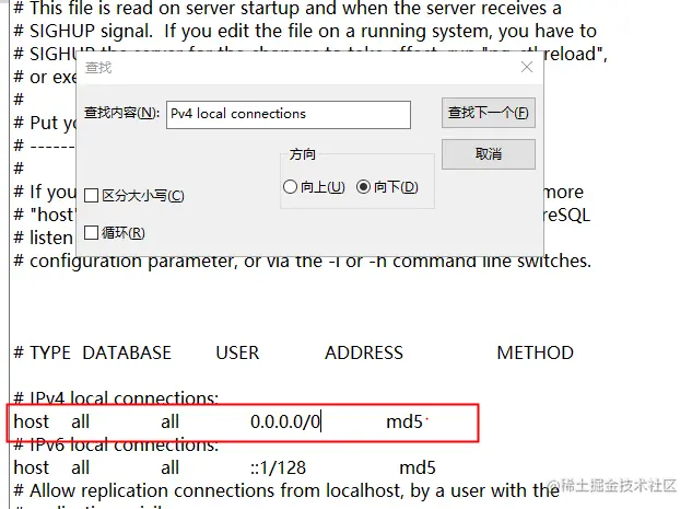 进入postgreSQL的data目录(C:\Program Files\PostgreSQL\12\data)找到pg_hba.conf,然后打开pg_hba.conf,然后搜索IPv4 local connections,修改内容如下图: