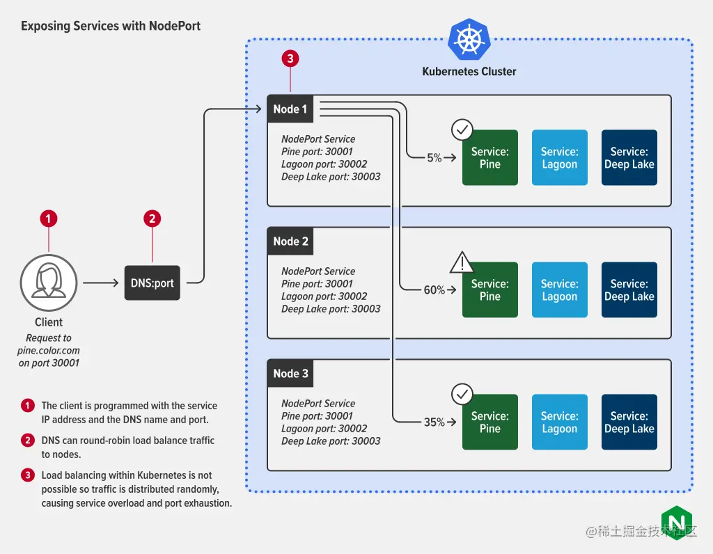 如下图所示,NodePort 没有在 Kubernetes 集群中提供负载均衡,因此流量会被随机分发给各个 service。这可能会导致 service 过载和端口耗尽。