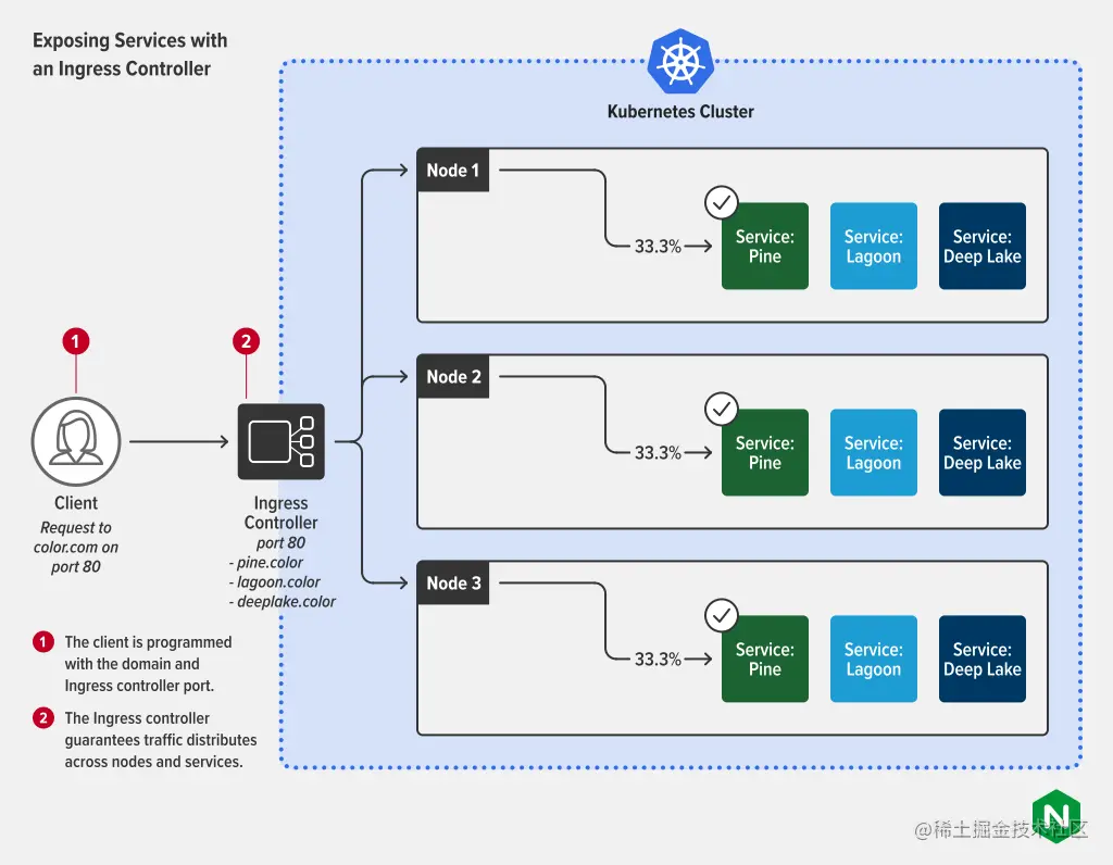 | 2 The Ingress controller guarantees traffic distributes across nodes and services. | 2 Ingress controller 保证流量分发到各个节点和 service。 |