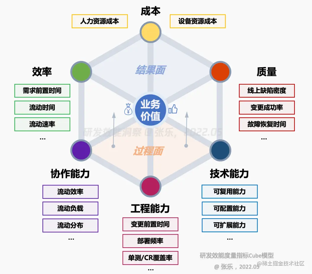 我们先来简单看看度量指标的 Cube 模型,我把它称为效能度量指标体系的「魔方」。它不是一个平面,而是立体的,大家可以在下图中将「业务价值」往上提,能看出来它其实是个立方体,它有「结果面」和「过程面」。从「结果面」需要考虑的,分别是效率、质量、成本和价值,可以概括为我们经常说的「多、快、好、省」。这里面有很多结果的指标,比如说需求交付周期、需求吞吐量、线上缺陷密度等等。为了达成这个指标,我们还有很多过程性的工作要做,所有也要看「过程面」,比如协作能力、工程能力、技术能力和组织能力的提升。所以,我们要基于结果指标做整体的评估和驱动,通过过程指标的细化和分析,去驱动具体的改进活动。