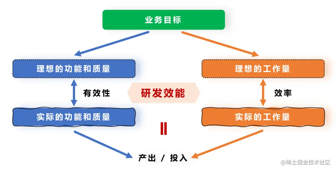 **效能的目标是什么?**基于业务目标,我们一般会规划两个元素——理想的功能和质量、理想的工作量。同时,有理想就有现实,所以也就会有实际的功能和质量、实际的工作量。通常,在理想和现实之间会客观存在一定的 Gap,这就出现了「效率」和「有效性」上的差距。所以,研发效能既要关注投入,也要关注产出;既要关注效率,也要关注有效性。