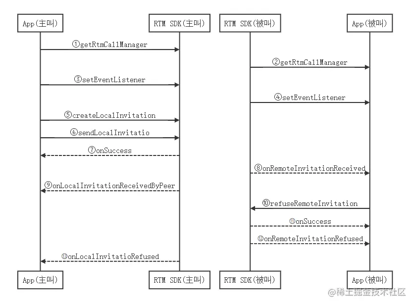 需要注意的是,在被叫同意/拒绝后,RTM 的呼叫流程其实就已经结束了。我们在通话中挂断需要通过 RTM 信令通知对方。比如向主叫发送一条个人信息
