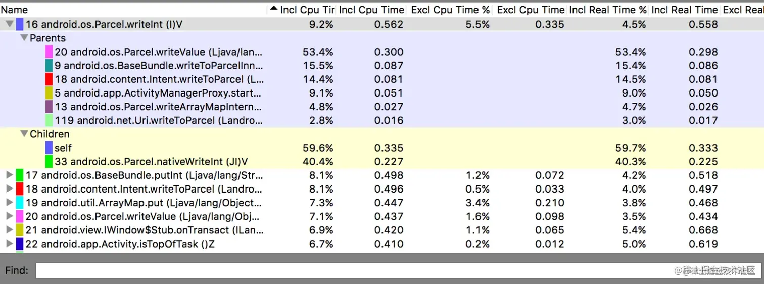 - 对于分析窗格中的每个顶级节点,表中的 Calls + Rec, Calls/Total 列(图 4 中未显示)会报告对相应方法的调用次数和递归调用的次数。而对于父方法和子方法,此列会显示被调用方法为顶级节点中方法的子级或父级的调用次数。