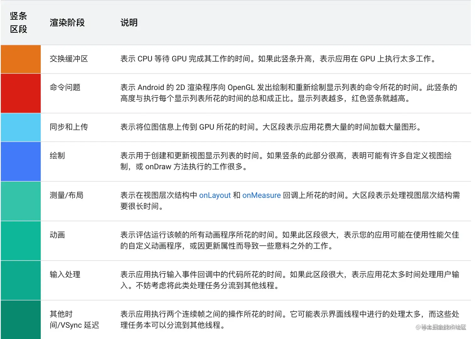 下表介绍了使用运行 Android 6.0 及更高版本的设备时分析器输出中某个竖条的每个区段。