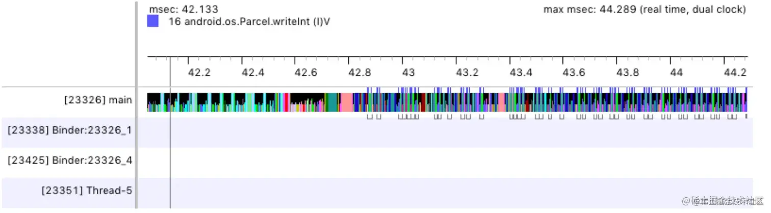 - 图3显示了时间轴窗格的特写。每个线程的执行情况都显示在各自的行中,并且越往右使用的时间越长。每个方法都以不同的颜色显示。第一行下面的细线显示所选方法的子级(从进入到退出)。