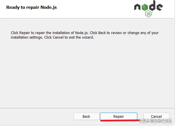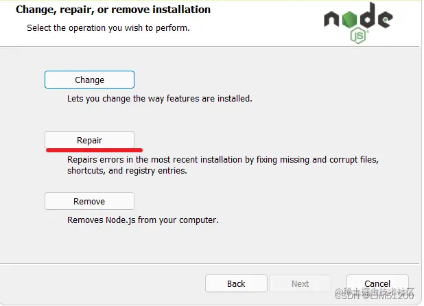 解决办法 在文件中找到 node安装包,点击重新安装 ,会 跳出第一个页面,然后点击 直到,出现第五个图片 为止 就可以了