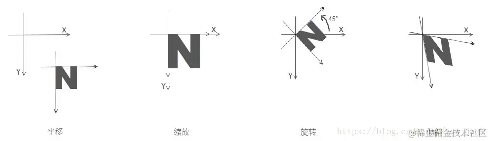 在PDF中添加内容时,为了让内容呈现某种的效果,例如将文字和图片旋转一定角度,我们需要借助坐标系转换来是实现这些效果。Spire.PDF中坐标系转换包括下如图3所示的四种方式,它们对应的方法分别是TranslateTrsanform, ScaleTransform, RotateTransform和SkewTransform。下面举例说明它们的用法: