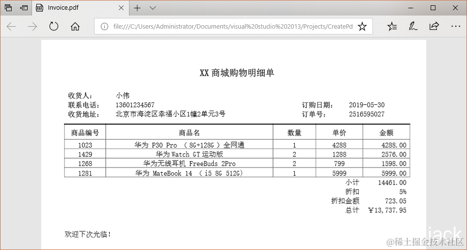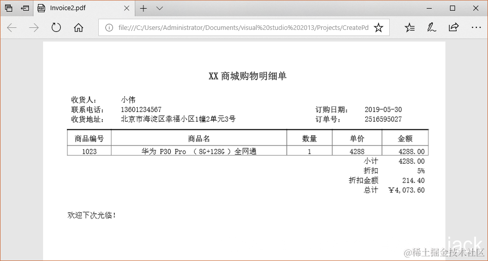 典型的发票包含客户和供应商的名称和地址、发票编号、购买物品的描述、付款金额等信息。为了动态地生成发票,我使用MS Word创建了一个模板,在该模板中设计好想要呈现的大部分内容及文档样式,然后通过代码替换文本和插入新内容,最后保存为PDF文档。用代码操作Word文档的部分需要使用免费版的Spire.Doc 7.1。