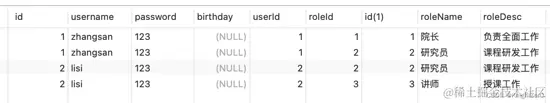 User{id=1, username='zhangsan', password='123', birthday=null, roleList=[Role{id=1, roleName='院长', roleDesc='负责全面工作'}, Role{id=2, roleName='研究员', roleDesc='课程研发工作'}]}