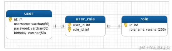 用户表和角色表的关系为,一个用户有多个角色,一个角色被多个用户使用