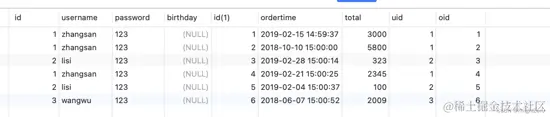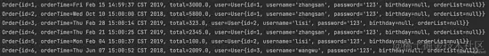 User{id=3, username='wangwu', password='123', birthday=null, orderList=[Order{id=6, orderTime=Thu Jun 07 15:00:52 CST 2018, total=2009.0, user=null}]}