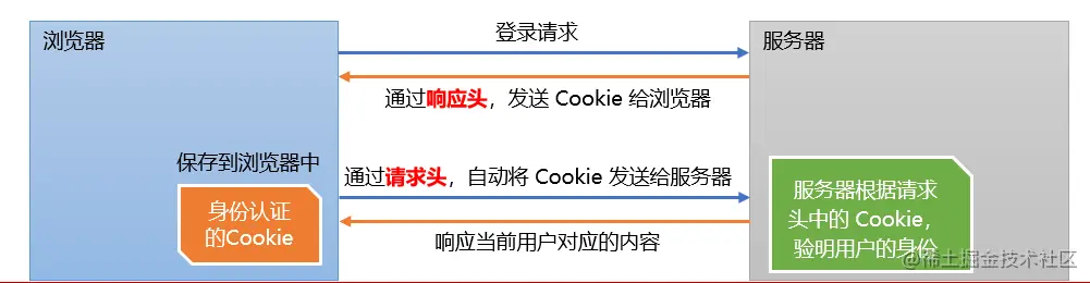 随后,当客户端浏览器每次请求服务器的时候,浏览器会自动将身份认证相关的Cookie,通过请求头的形式发送给服务器,服务器即可验明客户端的身份。