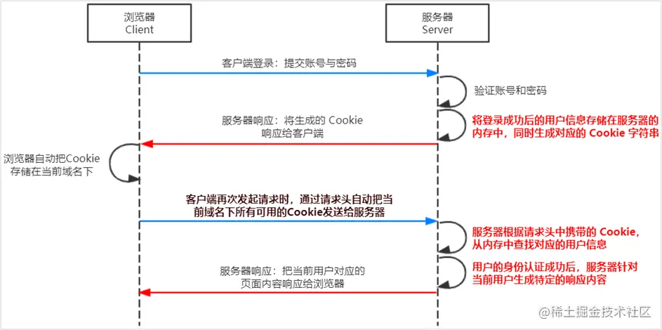 在登陆注册时,客户端会先将密码和账号发给服务端server,sever会验证密码和账号,并返回一个session_id给client,并且server也会把这个session_id存在数据库中,当client再次发送请求时,会携带该域名下的所有cookie给server,如果其中有用户的信息的session_id,server会拿取这个session_id到数据库查找对应的用户名和密码,如果与client的用户名密码一致,server才能验证成功身份返回对应的内容。