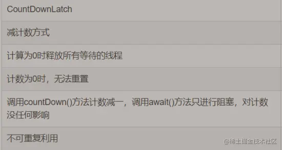 - CountDownLatch内部维护了一个虚拟的资源池,如果许可数不为为0一直线程阻塞等待,直到许可数为0时才释放继续往下执行;
