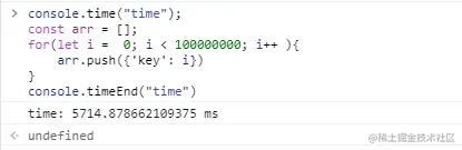 调试时测试代码执行时间,console.time()作为测试代码开始的节点,console.timeEnd()作为测试代码结束的节点,输出结果就是执行开始节点到结束节点的时间,单位为毫秒(ms)
