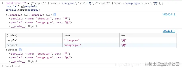 以表格形式输出对象,嵌套三层及以上的也会以表格的形式输出,但限于表格只能显示二维信息的特点,其会在嵌套三层的地方显示‘Object’字符串